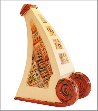 Haar inspiratie zijn Mediterrane en Arabische bouwstijlen. Thema’s als cocon, onmogelijk wonen, tijd, natuur versus bebouwing. Als materiaal gebruikt zij zelf samengestelde papierklei, bewerkt met oxides, glazuur en verrijkt met transfers en teksten gestookt op 1100 graden Celsius.